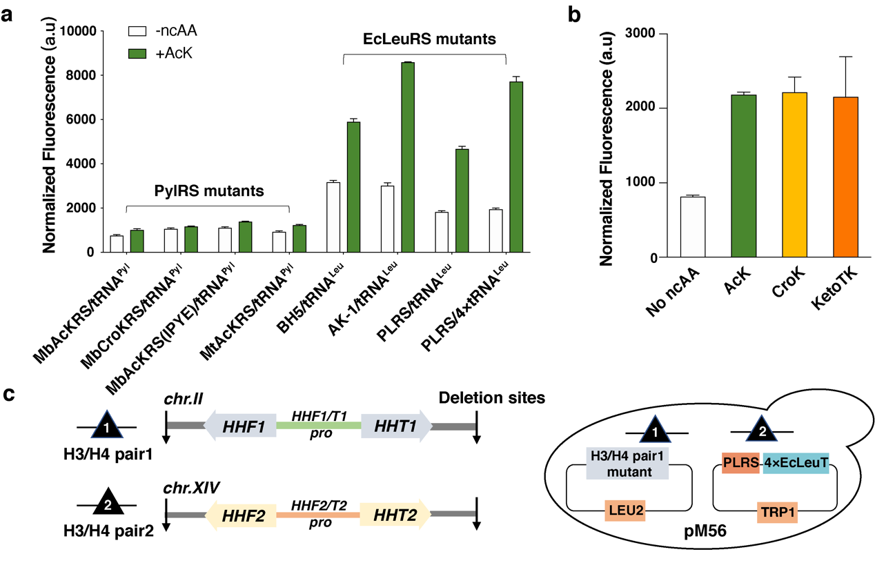 基因密码子扩展技术即通过与宿主生物正交的氨酰tRNA合成酶(aminoacyl-tRNA synthetase, aaRS)/tRNA对,将非经典氨基酸(Non-canonical Amino Acid,ncAA)编码到宿主目标蛋白的特定位点上。首先,研究人员汇总了现有的酿酒酵母基因密码子扩展体系(包括PylRS和E.coli LeuRS 体系),将EGFP的荧光信号强度作为GCE体系编码效率的评估指标,并构建了一系列GCE体系,比较这些体系将乙酰赖氨酸(Acetyl-lysine,AcK)插入到EGFP 特定位点的效率,从中筛选出插入效率高且正交的GCE体系 --- PLRS/4xtRNALeu对(图2a)。同时研究人员发现PLRS/4xtRNALeu对巴豆酰赖氨酸(Crotonyl-lysine,CroK)以及AcK类似物KetoTK具有较好的兼容性(图2b)。