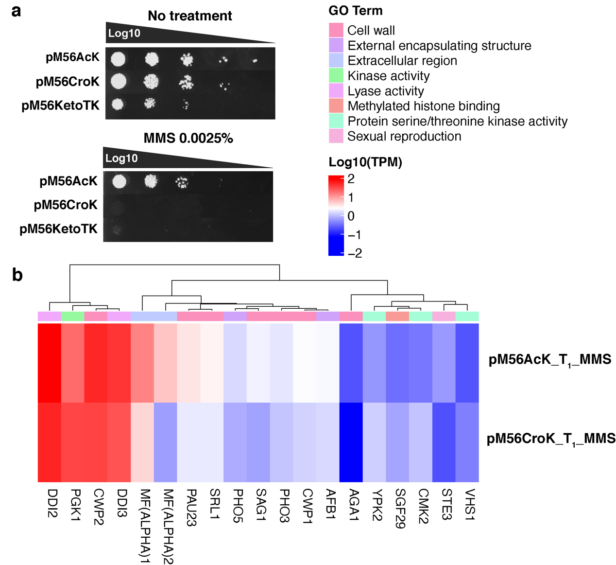 在CTM菌株中,基因组编码的野生型组蛋白H3被CTM组蛋白H3突变体所取代。组蛋白H3突变体可借助酿酒酵母基因密码子扩展体系对其56位点进行ncAA突变获得。这一菌株被命名为pM56菌株(图2c),该菌株呈现出ncAAs依赖生长的特性,即在含有一定浓度ncAAs的培养基中,pM56菌株才能存活。研究人员针对不同pM56菌株中组蛋白H3K56位点酰化修饰水平进行定量蛋白组学研究,结果表明,pM56AcK菌株中组蛋白H3K56位点的乙酰化修饰水平(~12%)低于野生型酵母菌株(~23%),pM56CroK菌株中组蛋白H3K56位点除存在~14%的巴豆酰化修饰以外,还存在~10%的乙酰化修饰,这说明pM56菌株中存在动态的修饰调控过程。为了研究组蛋白H3K56位点发生乙酰化共修饰或巴豆酰化共修饰之后,二者的生物学功能存在哪些差异,研究人员首先做了pM56菌株DNA损伤耐受实验,比较pM56AcK和pM56CroK菌株对甲磺酸甲酯(methyl methanesulfonate, MMS)的耐受差异,结果显示,pM56AcK对MMS的耐受程度高于pM56CroK菌株(图3a)。RNA测序结果显示,相比于MMS处理的pM56CroK菌株,pM56AcK菌株中水解酶表达水平显著性上调,酵母生殖和细胞壁相关的基因也出现了上调表达的情况,而pM56CroK菌株中激酶相关基因表达水平上调(图3b)。