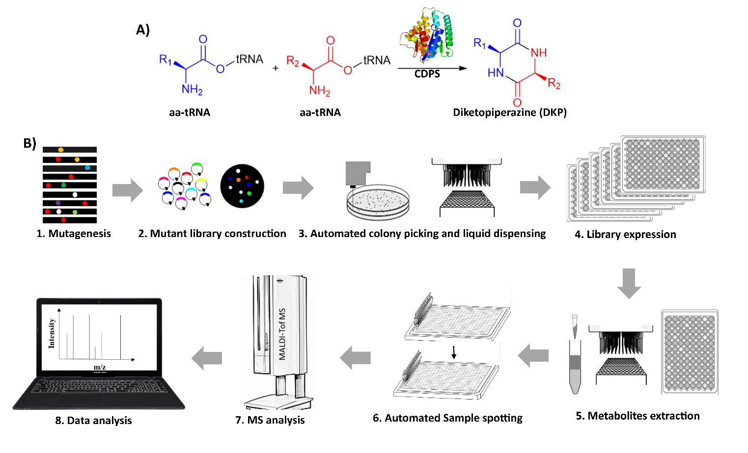 文章以环二肽合酶(cyclodipeptide synthases, CDPSs)为研究对象,验证无标记质谱筛选在酶定向进化中的应用。环二肽合酶利用氨酰-tRNA底物可以合成二酮哌嗪(diketopiperazines, DKPs)骨架;含有这类骨架的天然产物可以通过肠屏障、血脑屏障,是重要的药物先导化合物。然而,基于蛋白质工程改造环二肽合酶的成功案例非常有限,部分原因在于缺乏高通量的产物分析方法,相关研究仅限于少数理性设计突变。