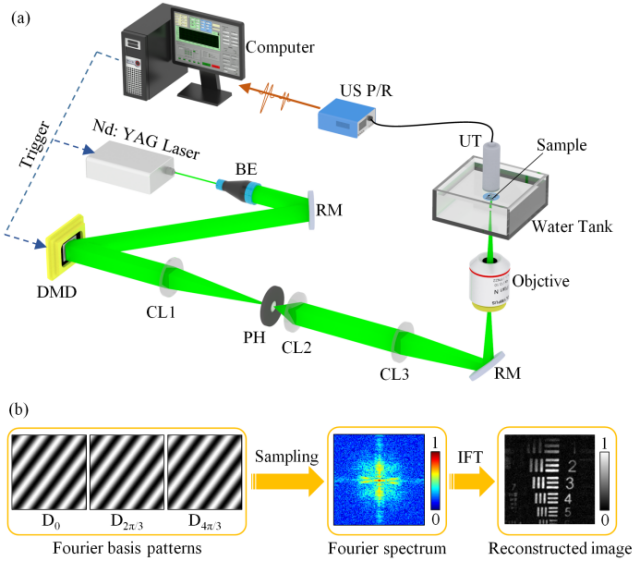 光声显微成像具备高分辨、三维无标记成像等优势,被广泛用于活体生物组织结构和功能成像。传统光声显微成像技术主要依靠逐点扫描进行三维图像采集,受限于步进电机、光学振镜等扫描器件的扫描速度局限,传统光声显微技术的成像速度远低于视频帧率(30 Hz),难以满足生物体快速生理活动监测的需求。针对该问题,研究团队提出了一种基于单像素成像技术的高速非扫描光声显微成像(SPN-PAM)。该技术利用高速数字微镜(DMD)实现成像区域的结构光场照明,通过快速调制结构光场的傅里叶照明条纹,获取图像的变换域频谱信息,采用傅里叶频谱逆变换即可完成图像快速重建。