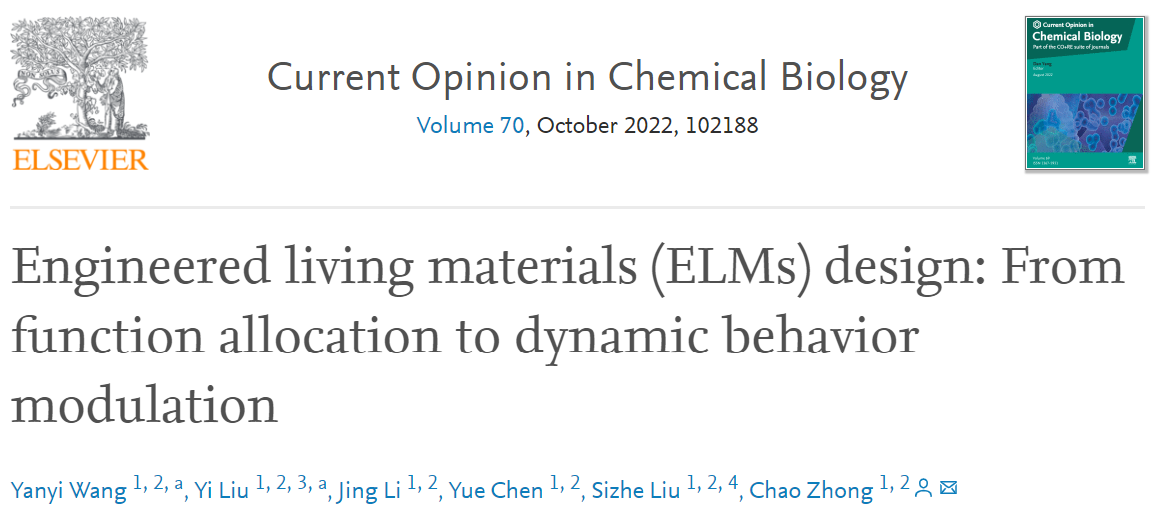 8月12日,中国科学院深圳先进技术研究院合成生物学研究所钟超课题组受国际知名学术期刊Current Opinion in Chemical Biology编辑部邀请,在其Synthetic Biology主题专栏中在线发表综述文章 “Engineered Living Materials (ELMs) Design: From Function Allocation to Dynamic Behavior Modulation”。