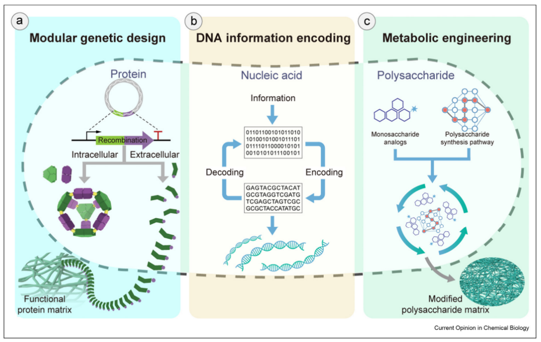 研究团队总结了三大类生命体中的内源性材料模块(蛋白质、核酸和多糖),它们能够被重新设计成新的功能分子,以赋予活体材料新的功能(图1)。文章中对每种材料模块的分子设计、修饰手段以及应用方向都给予了详细介绍。比如,蛋白质模块可以通过蛋白质重组的方法整合不同的功能,重组蛋白能够在体内自组装或分泌到胞外形成功能化的蛋白基质纤维;核酸模块多样化的碱基排列方式可以被用于编码和记录信息,这些信息可以在需要时被解码;多糖模块可以通过引入非天然单糖或者改造多糖代谢通路的方式进行修饰,以制备功能改性的多糖网络。