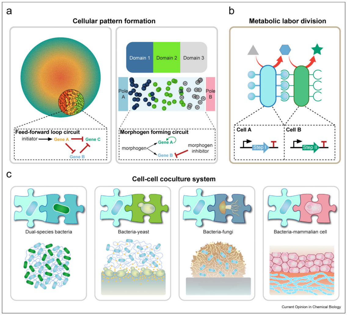 合成生物学和材料科学的结合已经衍生出了种类丰富的活体材料,它们被应用于生物制造、环境修复、疾病治疗等多个领域。与传统的非活体材料相比,这些材料在环境可持续性和动态响应性方面具有突出的优势。随着底盘细胞的快速开发以及用于细胞间通信的合成生物工具箱不断扩大,多细胞体系成为了未来的一个新趋势,因为其具有代谢分工、复杂底物的多组分利用及耐受苛刻环境等内在优势,借此可以搭建更稳定、适应性更强的活体材料平台。