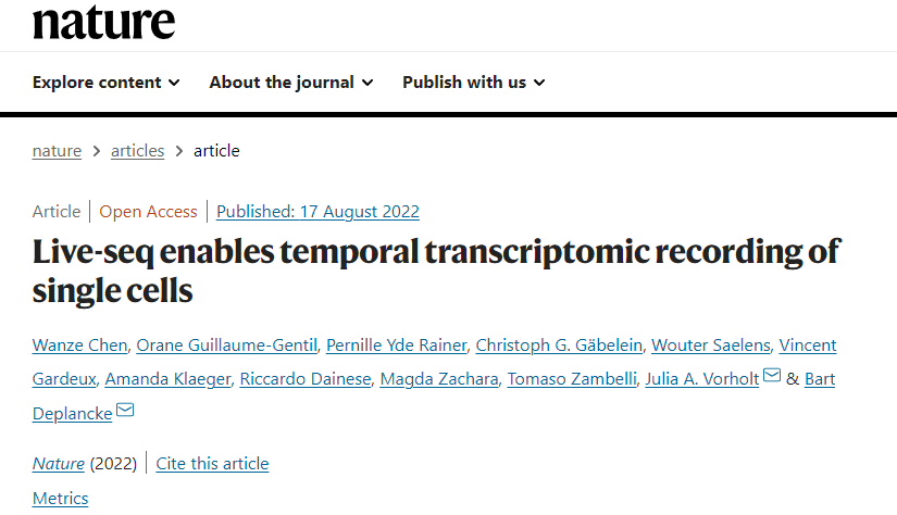 8月17日,中国科学院深圳先进技术研究院与瑞士洛桑联邦理工学院Bart Deplancke课题组、苏黎世联邦理工学院Julia Vorholt课题组的合作成果以article长文的形式在Nature上发表。题目为"Live-seq enables temporal transcriptomic recording of single cells"。
