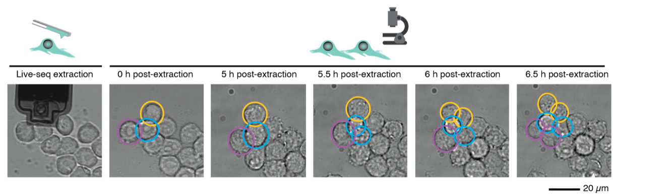 图二 Live-seq对细胞的影响。黄色的细胞被提取了细胞质,蓝色和紫色的细胞没有被处理。