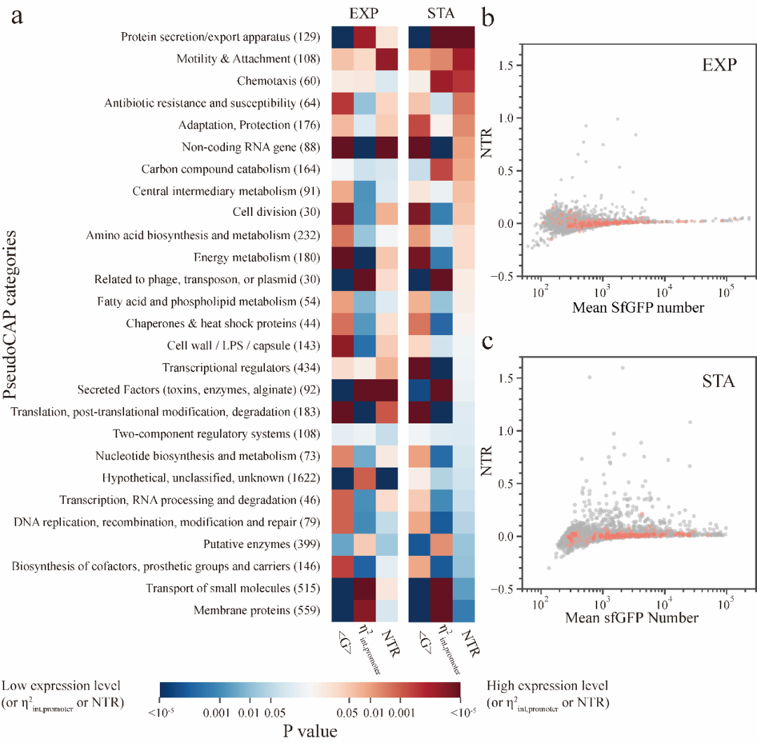 基因表达过程中各个步骤存在的随机性,造成的个体与个体之间的差异性,就是基因表达的噪声。转录过程中的噪声可以分成两部分:(1)转录起始的近泊松行为引起的随机噪声;(2)上游转录因子的表达水平和启动子结合状态波动引起的转录调控噪声(文中用NTR表示)。经过数十亿年的自然选择,转录调控噪声已经成为基因表达噪声的一部分,细菌可以通过进化和调控特定的调节网络来控制这种噪声。因此,转录调控噪声,而不是总表达噪声,反映了目标基因的潜在的调控模式。