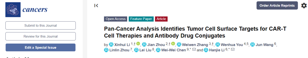 近日,中国科学院深圳先进技术研究院合成生物学研究所李汉杰课题组在国际学术期刊cancers上发表了题为《Pan-Cancer Analysis Identifies Tumor Cell Surface Targets for CAR-T Cell Therapies and Antibody Drug Conjugates》的研究成果。