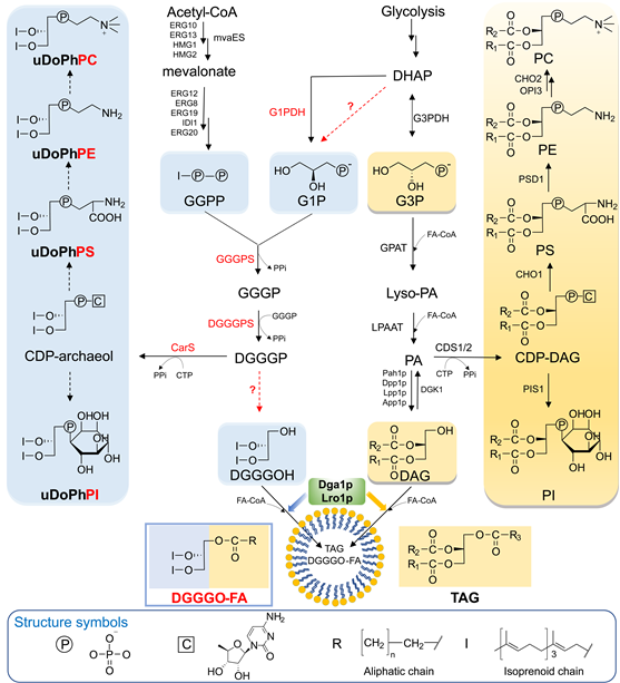 酿酒酵母(Saccharomyces cerevisiae)是一种模式真核微生物,具有详尽的遗传生化研究和丰富的合成生物学工具,是研究古菌-真核膜脂演化的理想宿主。依托合成生物“大设施”,作者采用模块化DNA组装方法,规模化构建了古菌细胞膜极性脂的生物合成通路,在酵母底盘中“即插即用”式引入产甲烷古菌、硫化古菌、Asgard古菌等不同来源的关键合成基因,成功合成了具备古菌醚键特征的极性脂(图1)。基于这一模型,作者发现酿酒酵母中竟然也具有合成G1P能力。与此同时,作者首次获得生化实验证据,支持Asgard古菌来源的GGGPS、DGGGPS酶可以合成兼具G1P、G3P手性的杂合膜脂(图 2)。这些观察说明膜脂分界并非像人们原来认为的那样严格。