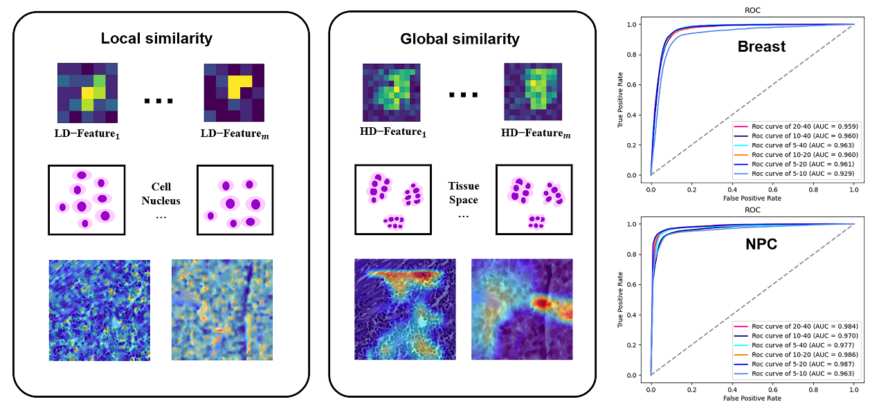 针对不同放大倍率下组织病理学图像信息融合的不足,秦文健团队通过长期不懈的积累,提出了一种创新性的深度多倍率相似性学习方法,该方法不仅有助于多放大倍率学习模型的可解释性,易于可视化低维(如细胞级)到高维(如组织级)的特征表示,克服了跨放大倍率信息传播理解的困难;同时借助于相似性交叉熵损失函数的设计,可以更好学习交叉放大倍率之间信息的相似性。最后通过不同主干网络特征提取和不同放大倍率组合的实验验证了所提出方法的有效性,并进一步通过可视化方式展示其解释能力,分别在公开和临床的组织病理学数据集上开展实验以验证方法性能,与现有方法对比,其曲线下面积(AUC)、准确度均取得了优异的性能。相关研究工作以“Deep Multi-Magnification Similarity Learning for Histopathological Image Classification”为题发表于生物医学信息领域国际权威期刊IEEE Journal of Biomedical and Health Informatics(DOI: 10.1109/JBHI.2023.3237137),博士生刁颂辉为论文第一作者。