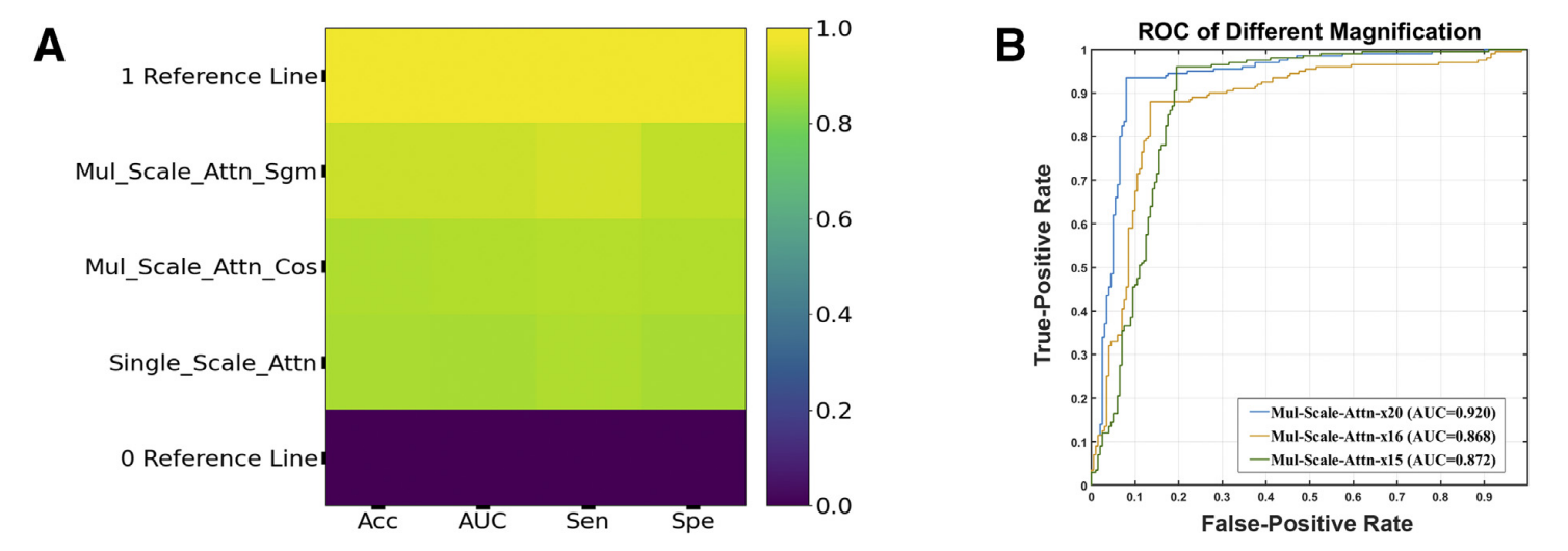 团队前期研究中发现,经验丰富的病理学家通常需要对全景病理图像中对癌/疑似区域进行视觉检查,得到最终的诊断结果。然而,由于全景病理图像具有单张巨大尺寸的特性,人工视觉诊断是一项劳动强度大和耗时的挑战性任务。为与临床实际诊疗步骤相结合,并验证算法在临床的有效性,团队与临床医院合作实现了自动诊断算法的研究——提出了基于多倍率注意力卷积神经网络的弱监督框架。该方法只需图像级标签(而不需要像素级注释),即可以实现感兴趣区域(癌症)的检测,为临床病理医师的诊断直接提示可疑病灶区域,提升临床辅助诊断效率。所提出方法在TGCA肝癌数据集进行论证。实验结果表明,根据曲线下面积、准确度、灵敏度和特异性指标,该框架显著优于单尺度检测方法,并提供了非常快的检测时间。同时,方法与三位病理学家的诊断结果相比,团队提出方法的性能优于初级和中级病理学家,略低于高级病理学家。相关研究工作以“Weakly Supervised Framework for Cancer Region Detection of Hepatocellular Carcinoma in Whole-Slide Pathologic Images Based on Multiscale Attention Convolutional Neural Network”为题发表于病理学领域权威临床杂志The American Journal of Pathology,(DOI: 10.1016/j.ajpath.2021.11.009),博士生刁颂辉为论文第一作者。
