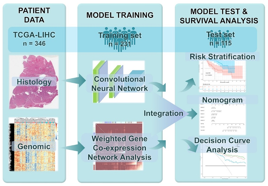 为融合病理图像形态学信息与分子基因功能信息实现病人生存状态的准确预测,团队结合前期病理图像计算的工作积累,设计了融合病理图像与基因的多模态生存预后预测模型,揭示了多模态信息对癌症预后有很大的潜力,通过多模态模型的建模有望为辅助临床诊断与决策提供有效工具。相关研究工作以“Integrative Histology-Genomic Analysis Predicts Hepatocellular Carcinoma Prognosis Using Deep Learning”为题发表于Genes(DOI: 10.3390/genes13101770),硕士生侯嘉馨为第一作者。