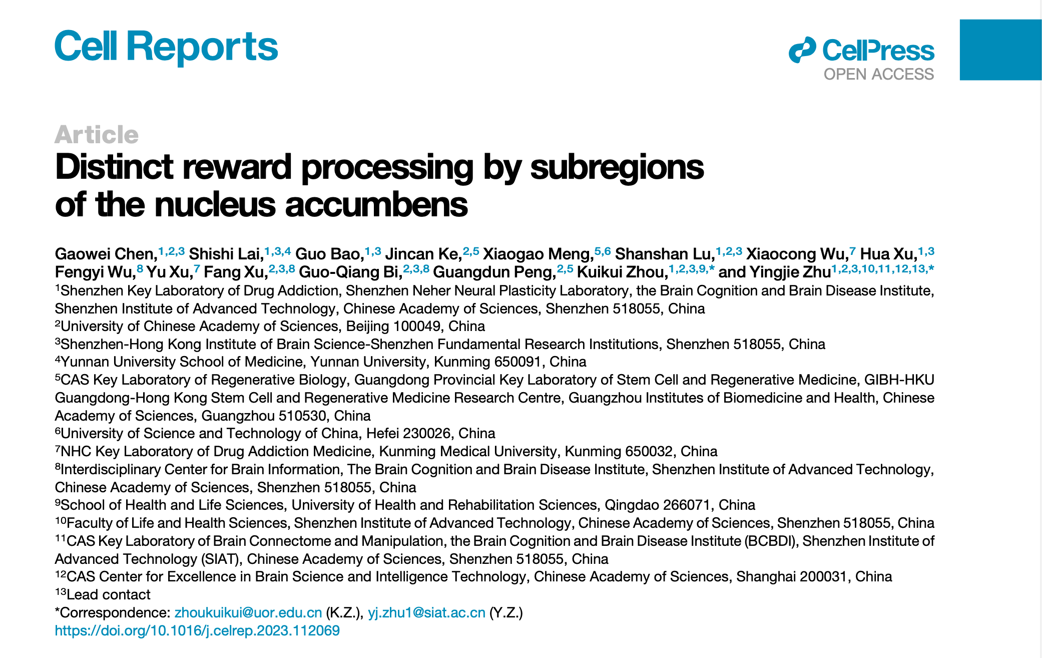近日,中国科学院深圳先进技术研究院脑认知与脑疾病研究所/深港脑科学创新研究院/深圳理工大学(筹)朱英杰团队,在Cell Reports 杂志在线发表了题为“Distinct reward processing by subregions of the nucleus accumbens” 的文章,揭示了伏隔核不同亚区在分子、环路及奖赏编码中的特征,为未来在生理和疾病情况下伏隔核功能亚区的细分提供了新的理论框架.