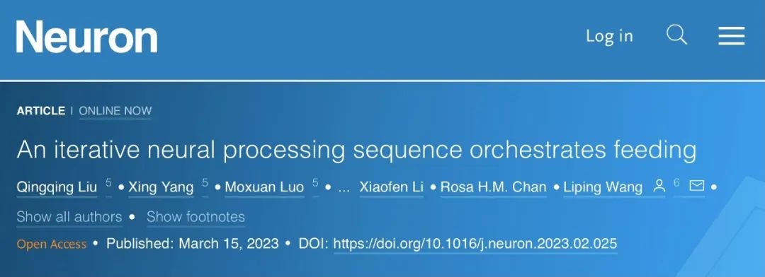 1. Liu, Q., Yang, X., Luo, M., Su, J., Zhong, J., Li, X., Chan, R.H.M., and Wang, L. (2023). An iterative neural processing sequence orchestrates feeding. Neuron 1–15