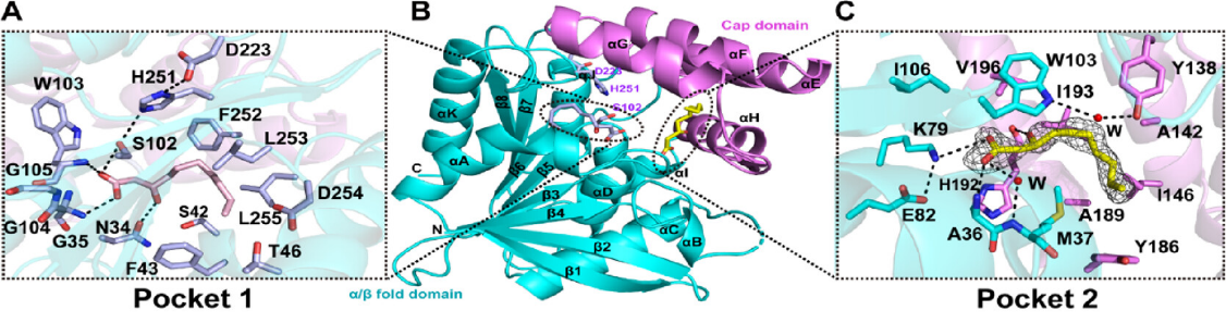 为克服这些局限,本研究通过X射线晶体学方法首次解析了铜绿假单胞菌(Pseudomonas aeruginosa)来源RhlA的蛋白质结构,揭示了RhlA具有α/β水解酶折叠结构。出乎意料的是,除Ser-His-Asp催化中心附近经典的配体结合口袋1外,研究人员还发现了另外一个配体结合口袋2,该口袋中结合有游离的3-羟基脂肪酸,推测可能是反应中间体。