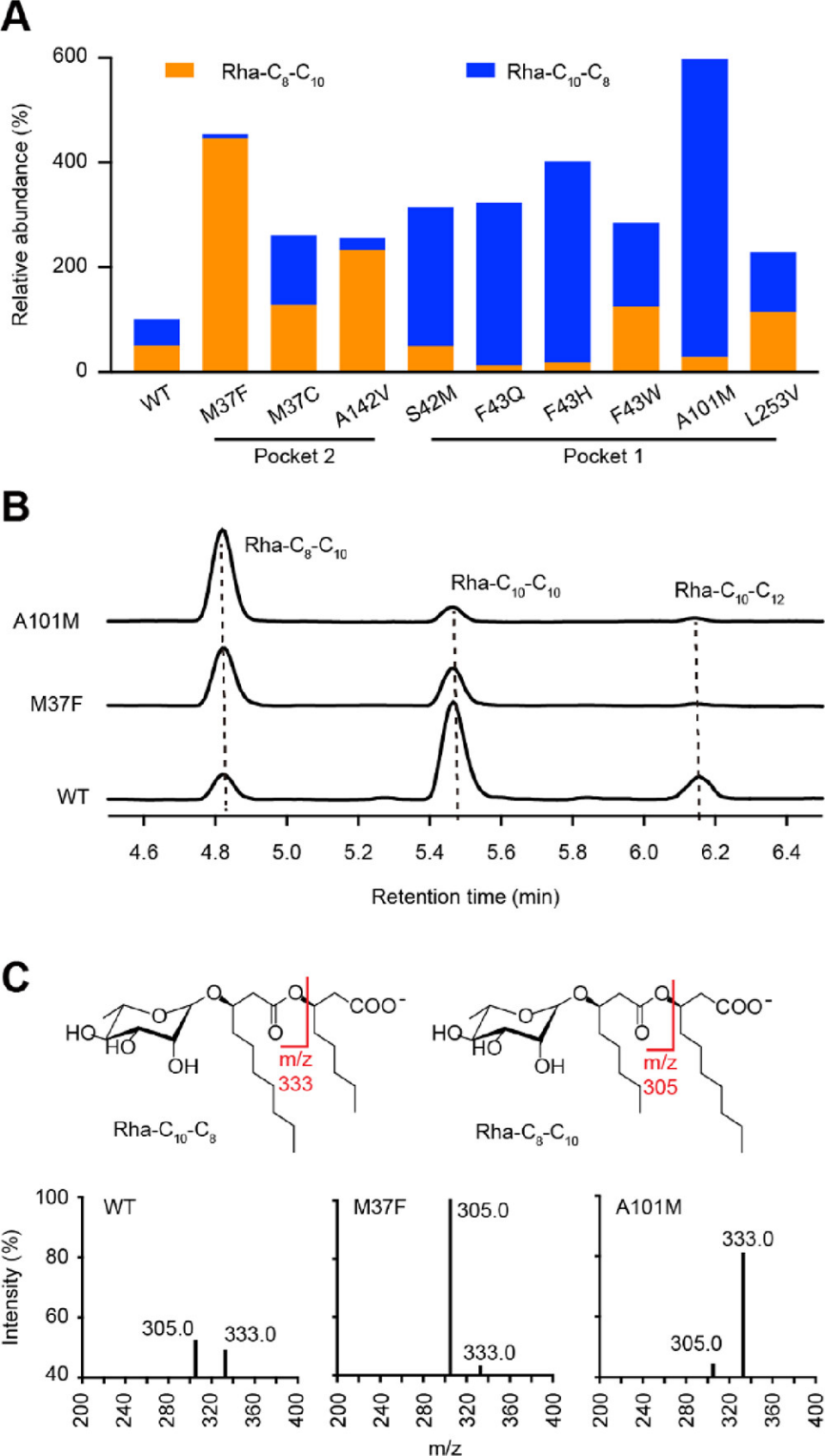 研究人员进一步应用半理性设计,针对两个结合口袋中的13个关键氨基酸残基位点构建了定点饱和突变文库,应用高通量MALDI-TOF质谱方法筛选了上千株突变株,最终得到了RhlA底物选择性显著变化的9个突变体,并发现不同结合口袋的突变对于HAA中两个脂肪链的长度具有不同的调节作用。团队对RhlA的三个典型突变体(Met37Phe、Phe43His和Ala101Met)开展了重组表达、蛋白纯化与体外酶动力学分析,发现kcat是决定发酵液中不同RL同系物比例的关键参素。