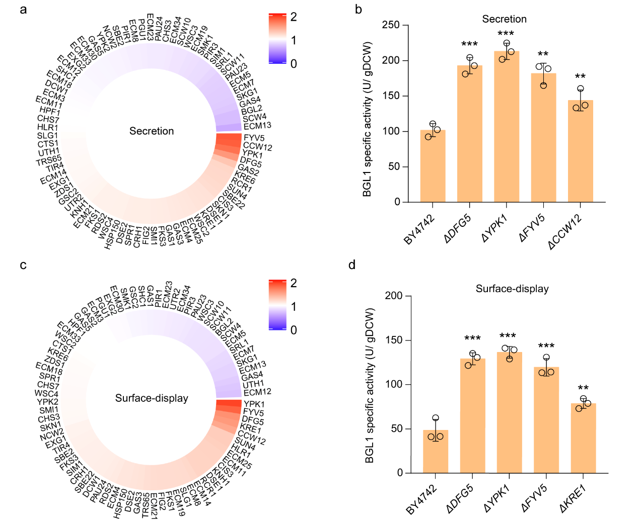 在本研究中,作者首先选取来自Saccharomycopsis fibuligera的β葡萄糖苷酶(β-glucosidase, BGL1)作为报告蛋白,以其分泌(secretion, sBGL1)和表面展示表达的活性(surface-display, dBGL1)作为指标,系统性地评估了79个参与细胞壁合成基因的敲除对sBGL1和dBGL1活性的影响。经过96深孔板培养筛选以及摇瓶发酵二次验证后发现,DFG5、YPK1、FYV5以及CCW12或KRE1基因的失活,能够显著提高sBGL1或dBGL1的活性(>40%)(图1)。