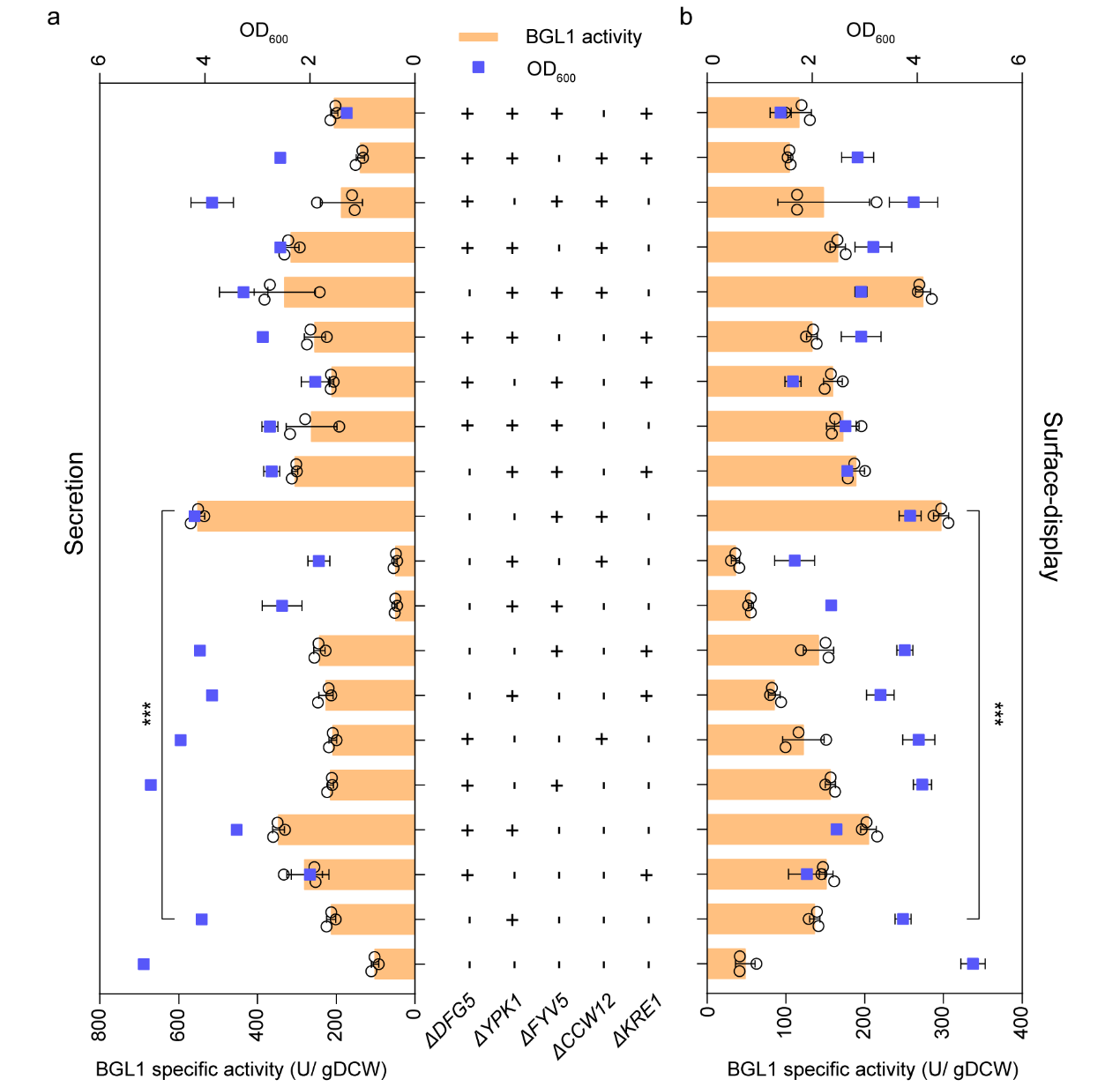 图2. 细胞壁生物合成的组合改造进一步提高sBGL1(a)和dBGL1(b)的活性