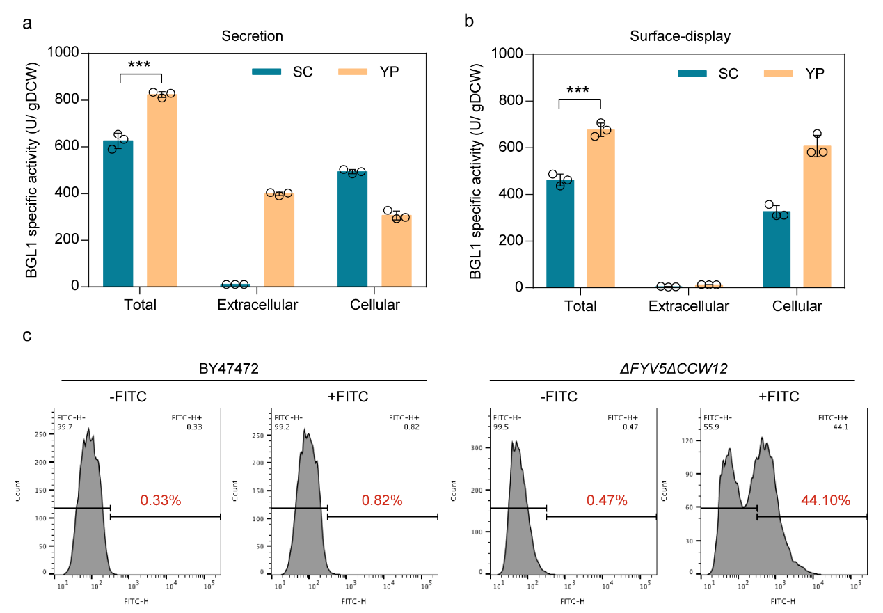 图3. 富培养基YP使ΔFYV5ΔCCW12菌株分泌和表面显示BGL1活性进一步增强。