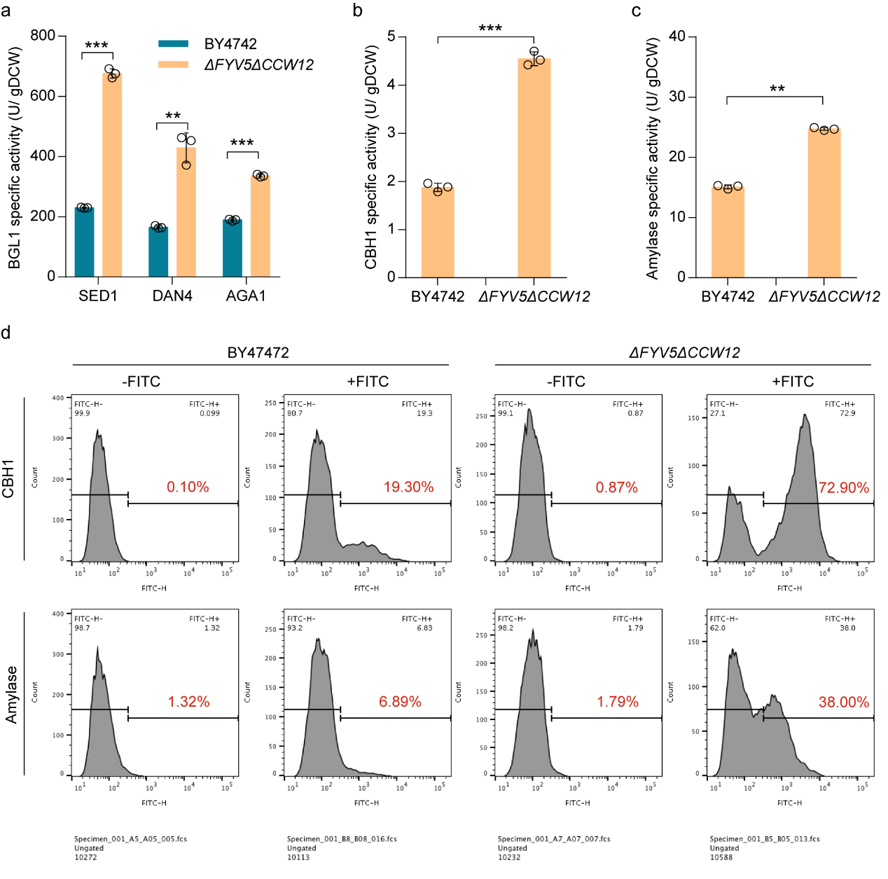 为了验证改造细胞壁合成途径具有普适性,该研究测试了FYV5和CCW12双敲除对不同锚定蛋白(Sed1p, Dan4p, Aga1p)和不同重组酶的影响。研究结果显示,FYV5和CCW12双敲除能提高使用不同锚定蛋白的BGL1活性,也能促进使用同一锚定蛋白的不同重组酶的活性(图4),包括纤维二糖水解酶(cellobiohydrolase, CBH1)和淀粉酶(Amylase)。