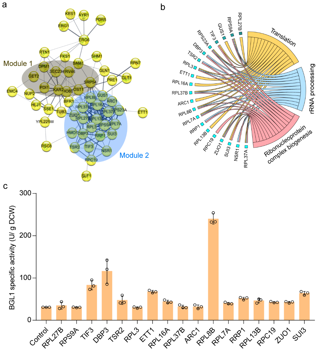 为了探究FYV5和CCW12双敲除菌株提升重组酶胞外表达的潜在机制,该研究对改造菌株和野生型菌株进行了蛋白质组学测试,发现FYV5和CCW12双敲除能引发系列蛋白的上调表达,除了分泌途径关键节点—内质网蛋白加工过程(protein processing in the ER),蛋白翻译(protein processing in the ER and protein translation)过程也是主要的被调控模块之一(图5)。通过逆向代谢工程研究发现,过表达12个蛋白翻译过程的蛋白,能提高BGL1胞外活性,其中,过表达RPL8B、DBP1、TIF3、ETT1和SUI3能将BGL1活性分别提高6.8、2.7、1.7、1.2和1.1倍(图5c)。