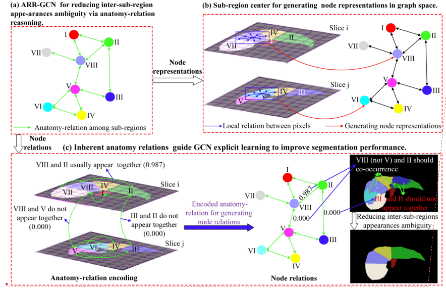 基于此,中国科学院深圳先进技术研究院生物医学与健康工程研究所联合国外团队在子区域构建图的基础上提出了一种新颖的分割框架——解剖关系推理图卷积网络,该方法可以将子区域间固有的先验解剖关系以邻接矩阵形式编码,将其嵌入到图的中间节点,从而实现对网络模型的显式学习。肝段和肺叶两种解剖功能区域分割任务实验验证结果表明,基于解剖图网络的分割方法有效减少了子区域间的外观模糊性。