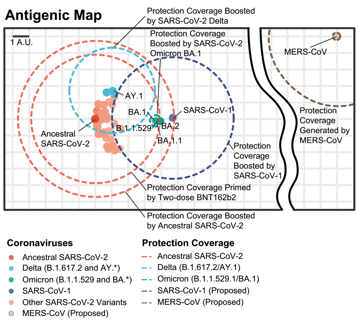 通过这一工具,研究者绘制了新冠的抗原地图,并预测了采用不同毒株的作为免疫加强针的保护范围,包括了新冠始祖毒株(Ancestral SARS-CoV-2)、新冠德尔塔毒株(SARS-CoV-2 Delta,B.1.617.2/AY.1)、新冠奥密克戎毒株(SARS-CoV-2 Omicron,B.1.1.529/BA.1)、非典冠状病毒(SARS-CoV-1)和中东呼吸综合征冠状病毒(MERS-CoV)在内的候选毒株。模型结果显示,非典冠状病毒(SARS-CoV-1)作为疫苗株有望提供更广的保护力范围。而德尔塔毒株(SARS-CoV-2 Delta,B.1.617.2/AY.1)作为疫苗株虽然不及非典冠状病毒(SARS-CoV-1)的效果,但仍优于新冠奥密克戎毒株(SARS-CoV-2 Omicron,B.1.1.529/BA.1)。