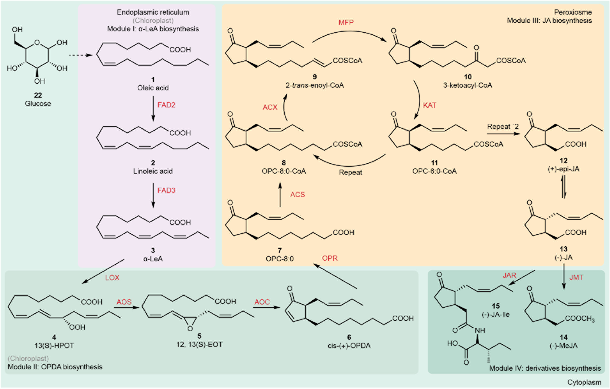 图1:茉莉素的生物合成通路。根据产物类型和合成场所的不同,将茉莉素在酵母中的重构途径分为4个模块:模块1在内质网中合成 -LeA;模块2在细胞质中合成OPDA;模块3在过氧化物酶体中合成JA;模块4在细胞质中合成MeJA和JA-Ile。灰色代表相应化合物在植物中的合成场所。
