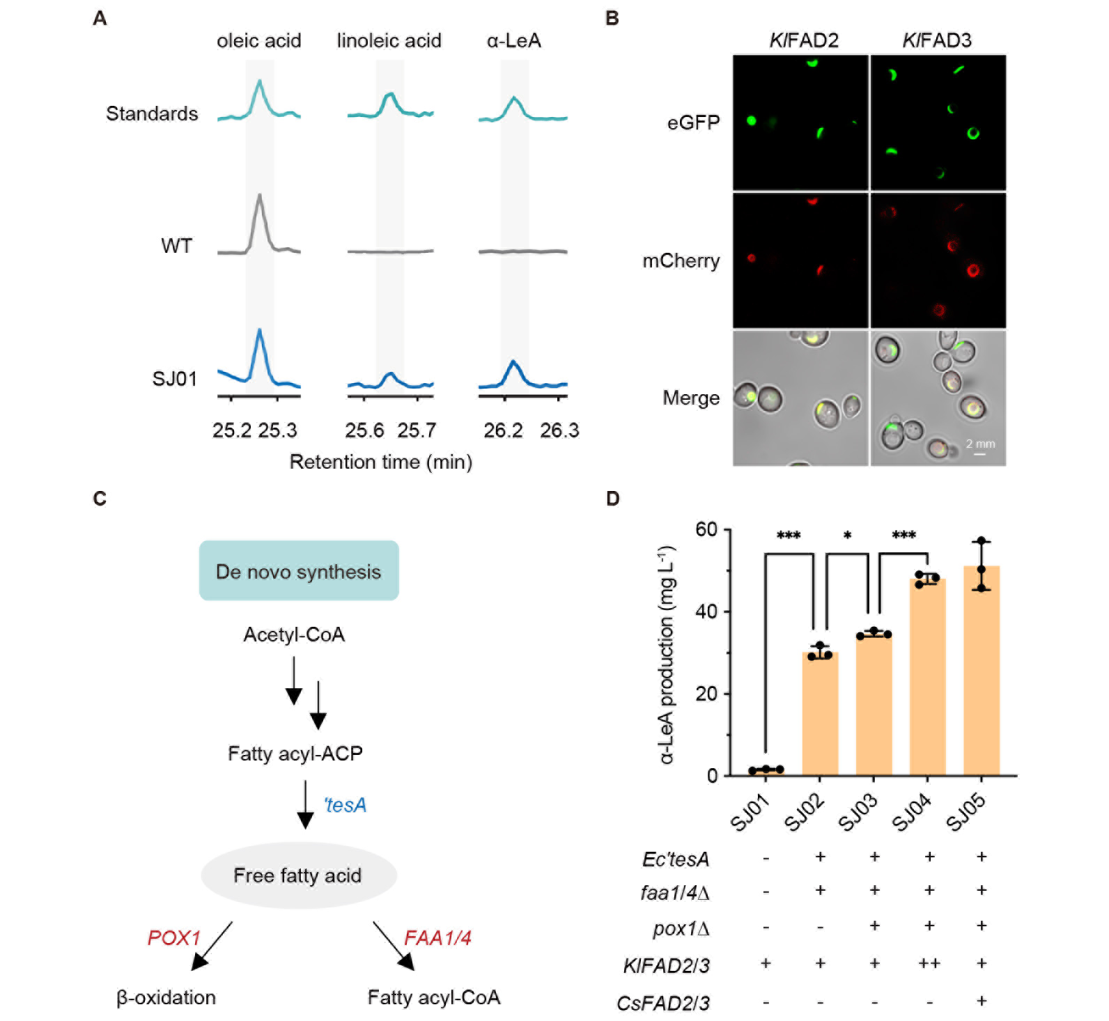 在该研究中,研究团队首先在酵母的内质网中合成 -LeA。 -LeA在植物的叶绿体中被合成,而酵母缺少叶绿体结构;酵母虽不能从头合成 -LeA,却可以在内质网中合成 -LeA的前体。受启发于此,该团队尝试在酵母的内质网中合成 -LeA。通过在酿酒酵母中引入克鲁维酵母来源的FAD,实现 -LeA在酵母的从头合成(图2A),但 -LeA的产量仅0.7 mg/L,远不够进行下游转化。共聚焦实验表明,相关基因均成功定位在内质网(图2B)。同时,研究人员还基于改造自由脂肪酸的代谢通路(图2C),将 -LeA的产量提升至51.2 mg/L(图2D)。