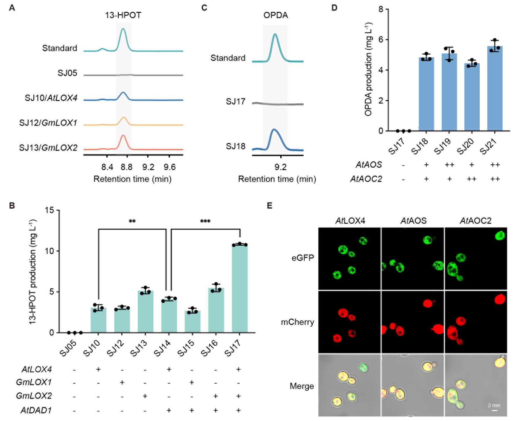其次,在酵母的细胞质中合成OPDA。OPDA在植物的叶绿体中被合成,同样需要在酵母中寻找适合OPDA合成的场所。细胞质和过氧化物酶体是潜在的候选选项:若在细胞质中合成OPDA,后续需要OPDA转运进过氧化物酶体完成下游转化;若在过氧化物酶体中合成OPDA,则需要底物 -LeA先行转运至过氧化物酶体。考虑到 -LeA在过氧化物酶体中被降解的可能性,该团队尝试将OPDA合成途径(LOX、AOS和AOC)定位至酵母的细胞质中。首先对不同来源的LOX进行活性筛选(图3A)和组合表达,将中间体13-HPOT的产量提升至10.8 mg/L(图3B)。继续引入AOS和AOC,成功实现OPDA的生产,产量4.9 mg/L(图3C和3D)。共聚焦实验表明,相关基因均成功定位在酵母的细胞质(图3E)。