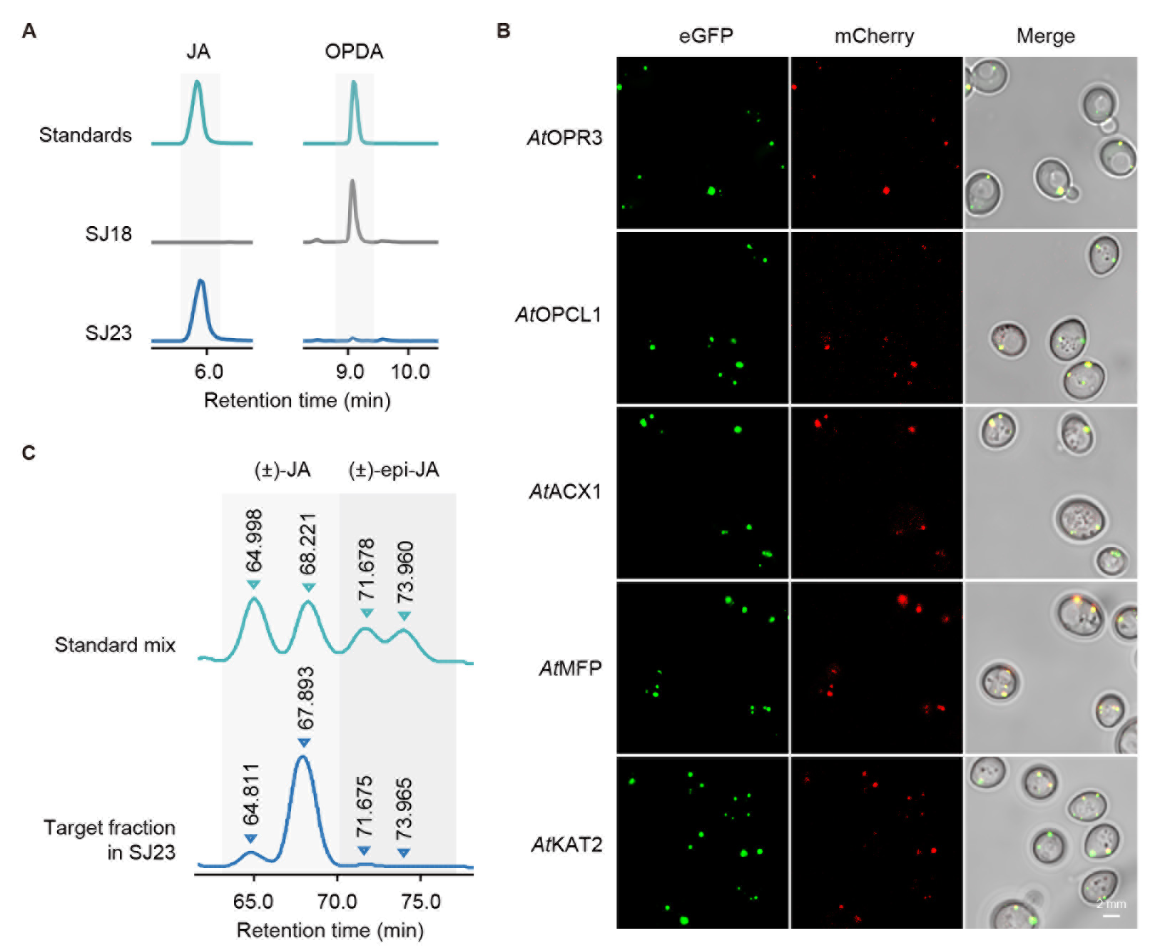 紧接着,在酵母的过氧化物酶体中合成JA。鉴于植物和酵母在 -氧化过程上的相似性,该研究直接模仿植物中JA的合成过程,在酵母中引入保留了自身过氧化物酶体定位肽的相关酶(OPR、ACS、ACX、MFP和KAT),在过氧化物酶体中成功实现JA的合成,产量达9.6 mg/L(图4A和4B),进一步饲喂底物 -LeA,JA的产量可达19.0 mg/L。