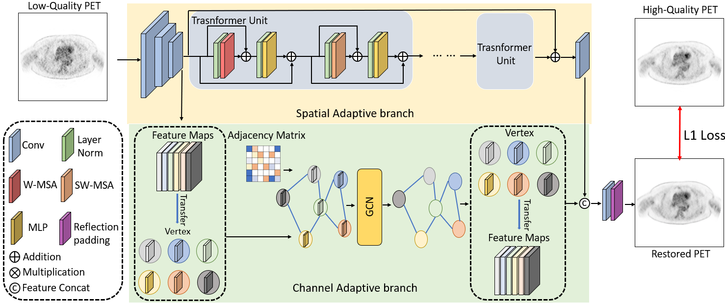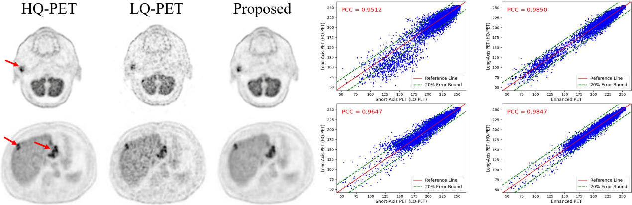 现有临床PET/CT系统由于轴向视野限制,在分辨率、扫描时间和辐射剂量等方面还有较大提升空间。最近,联影医疗推出的2米PET/CT可以同时实现人体全身PET成像、有效提高图像质量并降低辐射剂量。基于2米PET/CT获取的高质量图像,团队研发了一种短轴PET/CT系统的图像质量提升技术,可以实现短轴PET/CT重建图像的质量增强,以弥补其硬件上的轴向视野不足问题。提出模型采用Swin-Transformer和Watts-Strogatz拓扑结构双支设计,在短轴PET图像信息提取的同时兼顾空间和通道两个维度信息。实验结果表明,与现有深度学习和去噪方法相比,提出技术可以有效提高重建图像的信噪比和细节恢复能力。