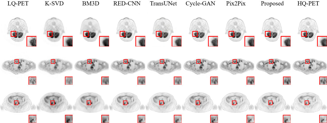 图3 不同方法的短轴PET图像质量提升结果