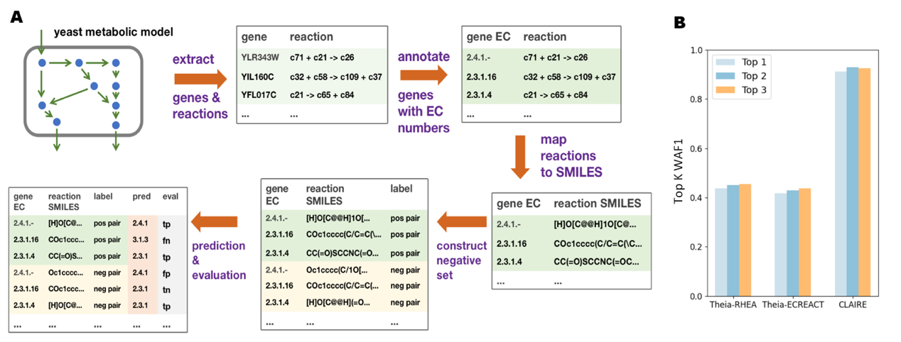 通过一系列严格的评估,研究人员展示了CLAIRE的强大能力:在酵母代谢模型中,它成功区分了真实的酶-反应配对与错误配对。代谢模型是生物体内代谢反应的定量化表示,涵盖基因、酶、代谢物及其细胞内分布,广泛应用于代谢工程和通量平衡分析等领域。CLAIRE的加入使得研究人员能够更高效地分析和注释反应网络,为代谢研究提供了全新可能。