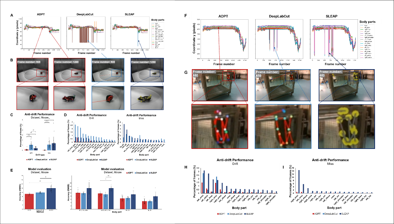 ADPT融合了卷积神经网络(CNN)与Transformer结构的优势,一方面利用CNN提取图像的局部精细特征,另一方面通过Transformer有效捕捉身体各部位之间的全局依赖关系,显著降低了关键点的漂移现象(图1)。与DeepLabCut、SLEAP等现有方法的对比测试显示,ADPT在复杂的多动物交互和长时程行为追踪任务中具有明显的精度与稳定性优势。
