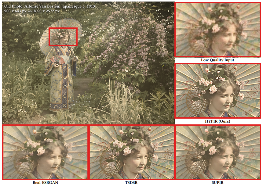例如,在老照片修复方面,研究人员运用HYPIR修复了国内外经典电影、电视剧老照片,让模糊的影像重现清晰的细节,为文化记忆传承提供了技术支持。在高分辨率图像修复领域,HYPIR同样表现出色,因其兼具速度与效果,HYPIR成功攻克了传统方法在生成8k分辨率图像时往往面临速度慢或效果不佳的难题。