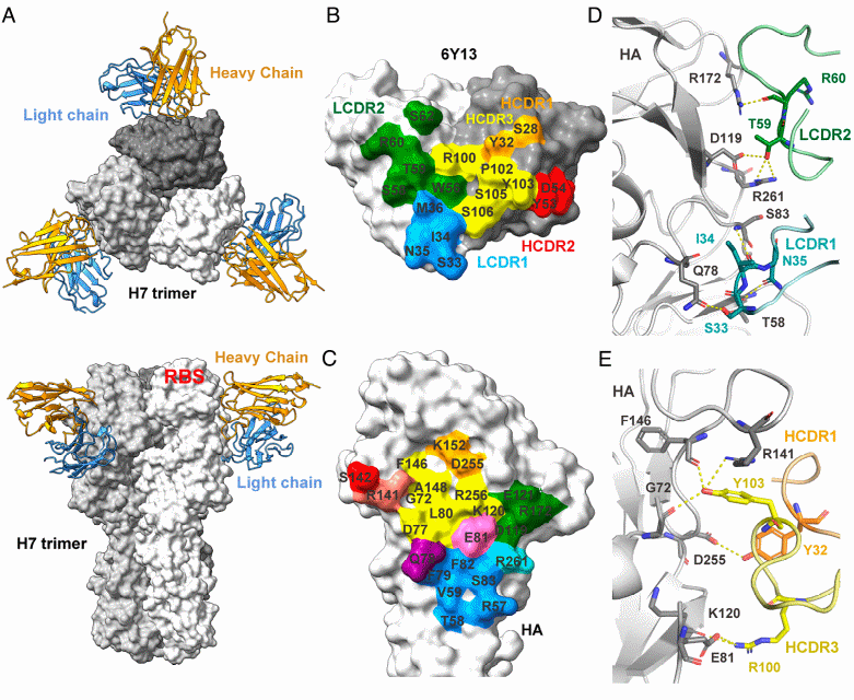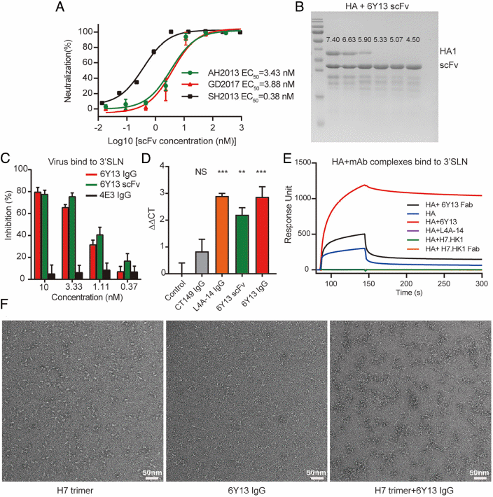 6Y13是人VH3-30基因编码的单克隆抗体,可以强效广谱中和H7亚型流行病毒(图1),并可以高亲和力结合跨越20年抗原进化的北美和欧亚系H7亚型禽流感病毒血凝素蛋白(图2),能够100%预防和治疗H7N9感染小鼠(图3)。抗体-抗原复合物冷冻电镜结构以及氢氘交换质谱等结果显示,6Y13结合在HA头部区受体结合位点侧边的一个独特保守表位(图4)。病毒吸附抑制实验和竞争结合ELISA实验等结果显示,6Y13通过抑制病毒的受体结合发挥中和作用(图5)。