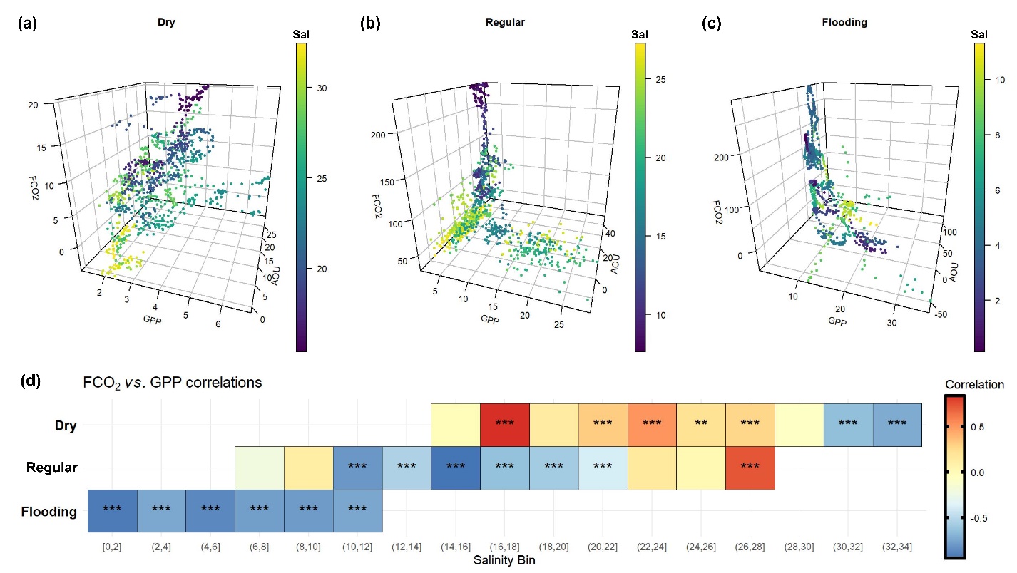 研究发现该区域并非单一的碳源或碳汇,而是一个由河流与海洋共同塑造的“空间划分的碳处理器”,上游(河流影响区)为强CO₂ 释放源,洪泛期通量峰值高达291.6 mmol C·m⁻²·d⁻¹;下游(海洋影响区)则转变为 CO₂ 吸收汇,净自养作用驱动通量降至-48.6 mmol C·m⁻²·d⁻¹;这一“源—汇”转变主要发生在距河口约40公里的空间阈值处,反映出水文混合与营养盐利用效率的综合调控作用。此外,研究揭示出大湾区蓝碳系统存在显著的季节性脉冲效应——洪汛期的碳通量远高于旱季,陆源输入的增强成为调控碳释放的关键因素。 尽管浮游植物光合作用驱动碳吸收,但高达 40%–60% 的固定碳会因异养作用被重新释放回大气。这种“即产即消”的机制形成了一个“碳循环回路”,显著削弱了河口生态系统的净固碳效率,也意味着基于叶绿素或卫星数据的碳汇估算可能被系统性高估。