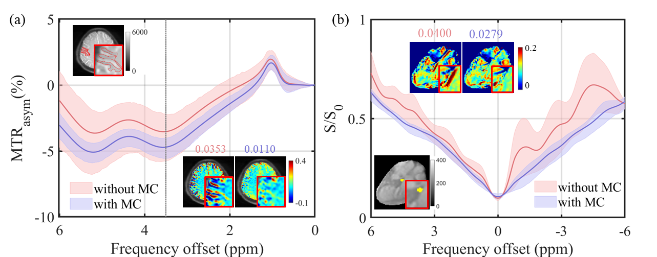 CEST-MRI作为一种无创反映组织代谢、微环境及分子交换特性的先进磁共振成像技术,正逐步应用于脑卒中、肿瘤及心肌代谢等领域。与常规 MRI 不同,CEST-MRI 需要在多个频率偏移点连续采集,扫描时间往往从数分钟到十余分钟。呼吸、心跳和体位轻微变化都可能导致帧间错位,而参数图又依赖对整个动态序列的逐像素整合,微小运动即可引入明显偏差,从而影响定量结果和临床诊断。与此同时,不同频率偏移点的饱和效应与组织对比度差异显著,图像在“发生运动”的同时还在“持续变亮变暗”,使得现有配准方法难以有效工作。因此,如何解决运动与强度变化之间的强耦合,已成为 CEST-MRI 实现精准定量的关键技术挑战。