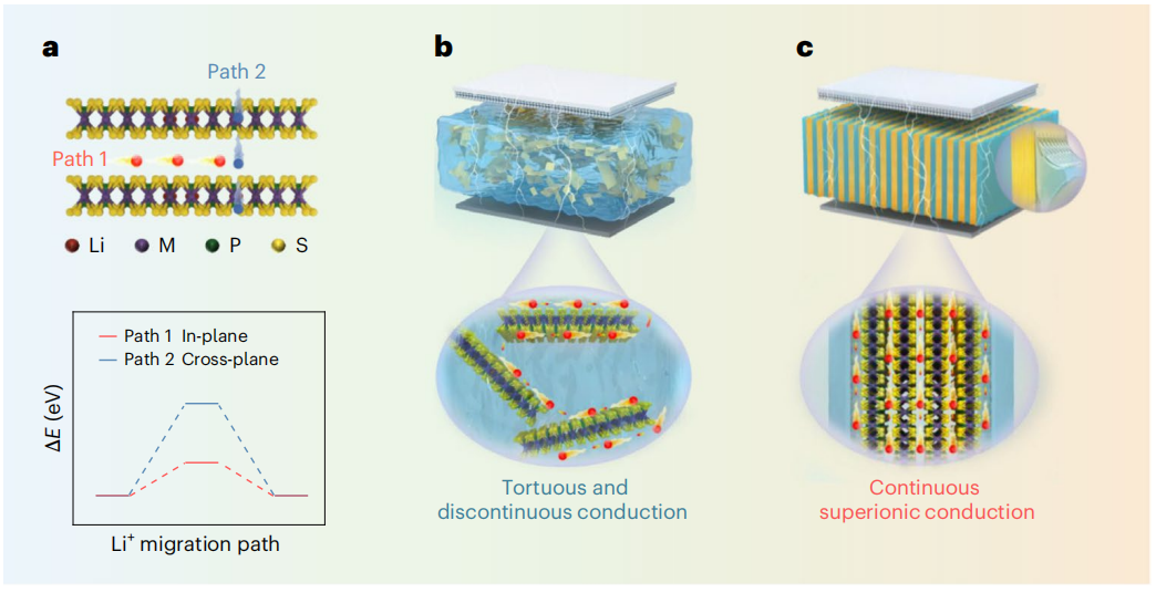 近日,中国科学院深圳先进技术研究院(以下简称“深圳先进院”)碳中和技术研究所成会明院士、彭晶副研究员联合华南理工大学胡仁宗教授,提出了一种新型复合固态电解质结构设计,成功实现了离子传导与机械柔性的解耦。该电解质在25 °C下实现了高达10.2 mS cm-1的离子电导率,同时能与电极保持紧密的机械接触。其复合结构由垂直排列的LixMyPS3(LiMPS,M为Cd或Mn)纳米片层与聚氧化乙烯(PEO)层交替堆叠而成:前者构建了连续的快离子传导通道,后者则确保了材料的柔韧性及界面相容性。相关成果以"Superionic composite electrolytes with continuously perpendicular-aligned pathways for pressure-less all-solid-state lithium batteries"为题发表在Nature Nanotechnology上。深圳先进院成会明院士、彭晶副研究员和华南理工大学胡仁宗教授为论文共同通讯作者。深圳先进院兰雪侠(博士后)和中国科学技术大学-深圳先进院联合培养硕士生李圳(已毕业)为该论文共同第一作者。深圳先进院为该研究第一单位。