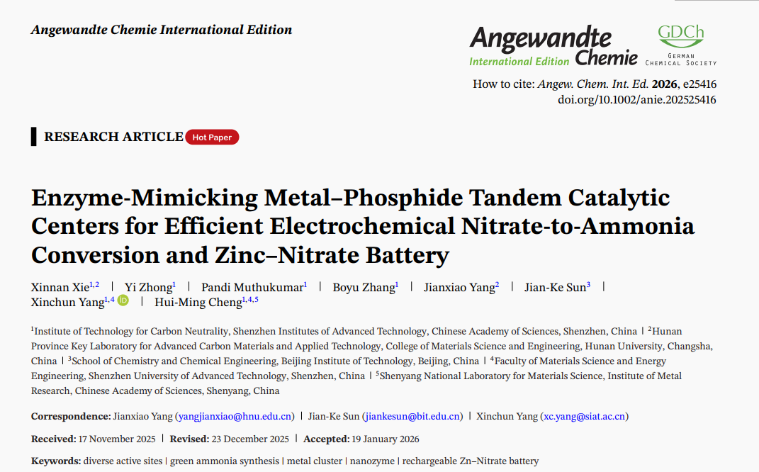 1月28日,中国科学院深圳先进技术研究院(以下简称“深圳先进院”)碳中和所低维能源材料研究中心杨新春副研究员团队,与北京理工大学孙建科教授团队、湖南大学杨建校教授团队合作,在Angewandte Chemie International Edition在线发表题为"Enzyme-Mimicking Metal Phosphide Tandem Catalytic Centers for Efficient Electrochemical Nitrate-to-Ammonia Conversion and Zinc–Nitrate Battery"的研究论文,提出一种基于金属团簇-金属磷化物纳米粒子构建双活性位点的仿酶催化策略,通过精准调控双活性位点间的临近效应,利用中间体溢流实现“接力催化”,有效解决了多步反应中的动力学失配问题,从而在大电流条件下实现了高效的绿氨合成。该工作为实现高效、可持续的绿氨合成提供了新思路,并为锌-硝酸盐电池体系的开发奠定了材料基础。本研究在中国科学院院士、深圳先进院研究员成会明的指导下完成。