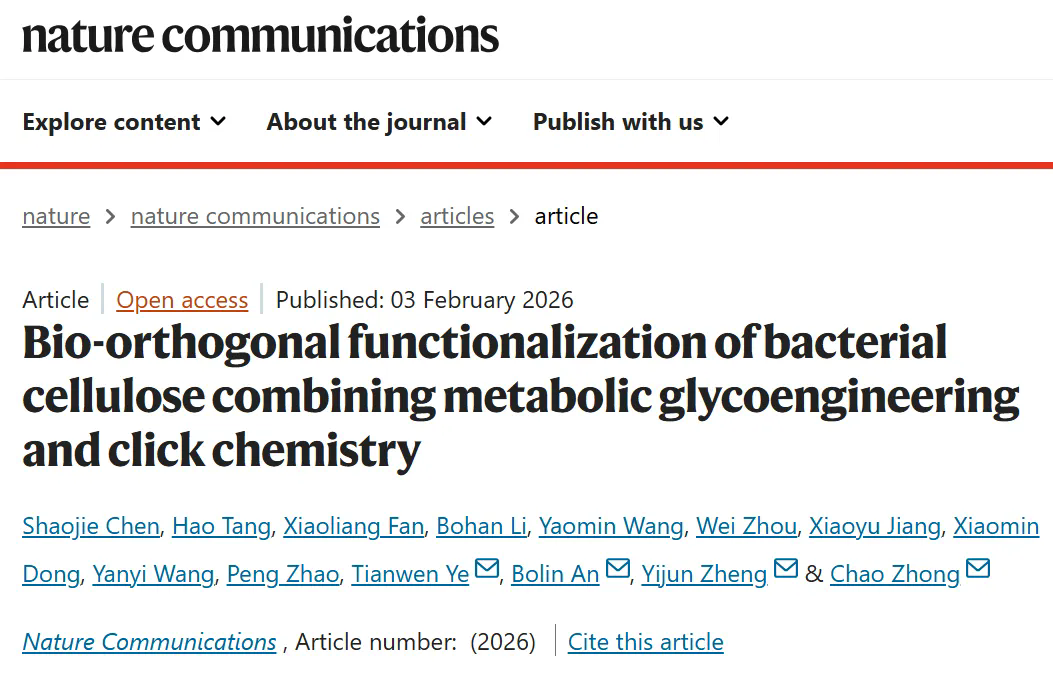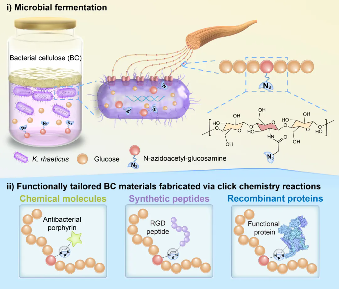 近日,中国科学院深圳先进技术研究院定量合成生物学全国重点实验室、合成生物学研究所钟超研究员、安柏霖副研究员,联合上海科技大学郑宜君教授与上海长征医院叶添文教授团队,在国际知名期刊Nature Communications发表研究成果。研究团队成功构建了一种通用的“生物正交功能化”平台,创新性地结合代谢糖工程与点击化学策略(2022年诺贝尔化学奖),将BC转化为可按需编程的“活性基座”,为其多功能集成与应用拓展开辟了新路径。该平台允许研究人员将不同尺度的功能分子(从小分子药物到大型蛋白质酶)按需且共价地“安装”到纤维素网络中,从而自由定制材料的生物活性。这项工作不仅展示了按需制造抗菌、促细胞黏附、酶催化等多种功能材料的能力,更提供了一个强大的材料功能化新范式,有望广泛应用于再生医学、生物传感和环境修复等领域。