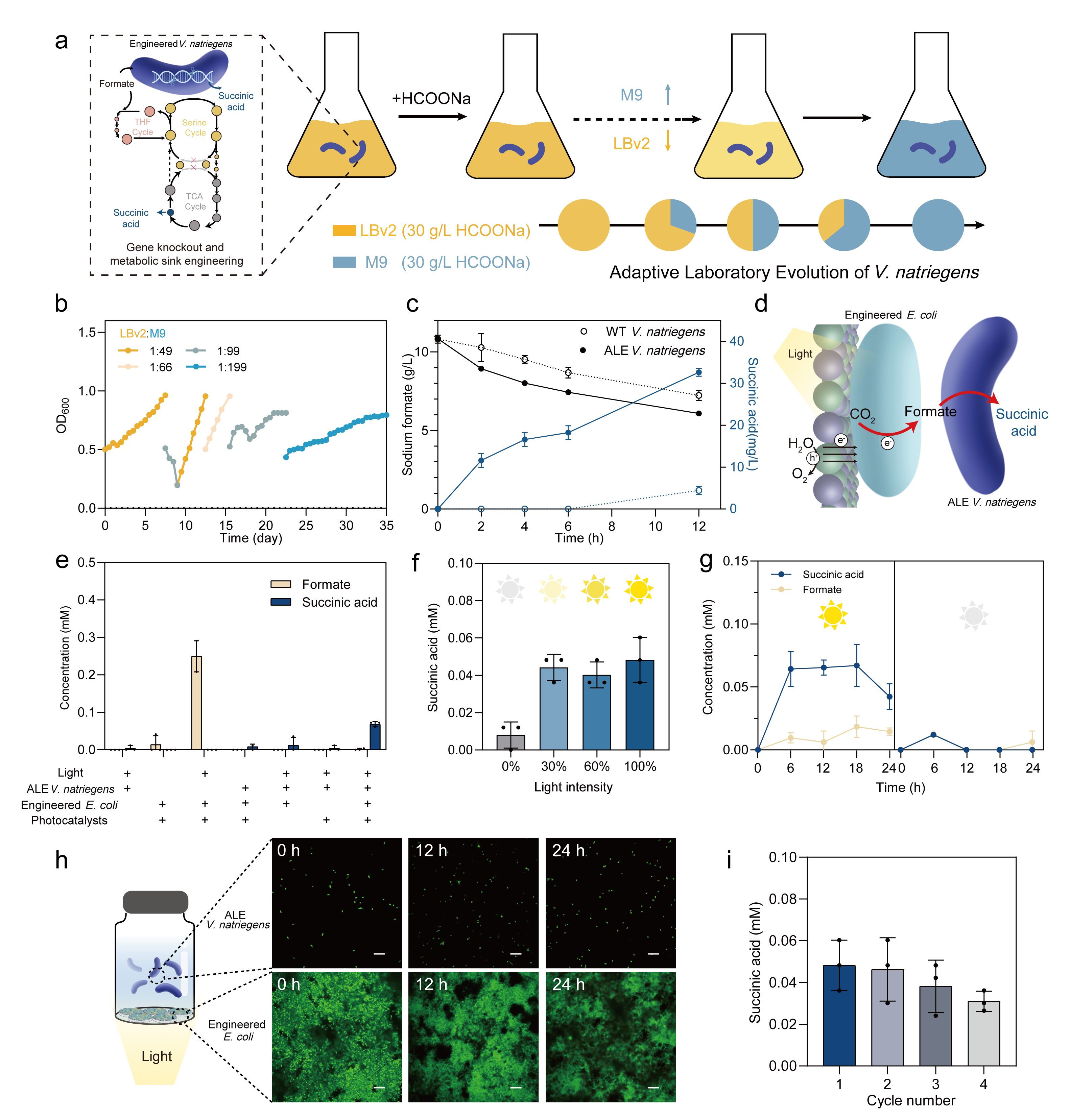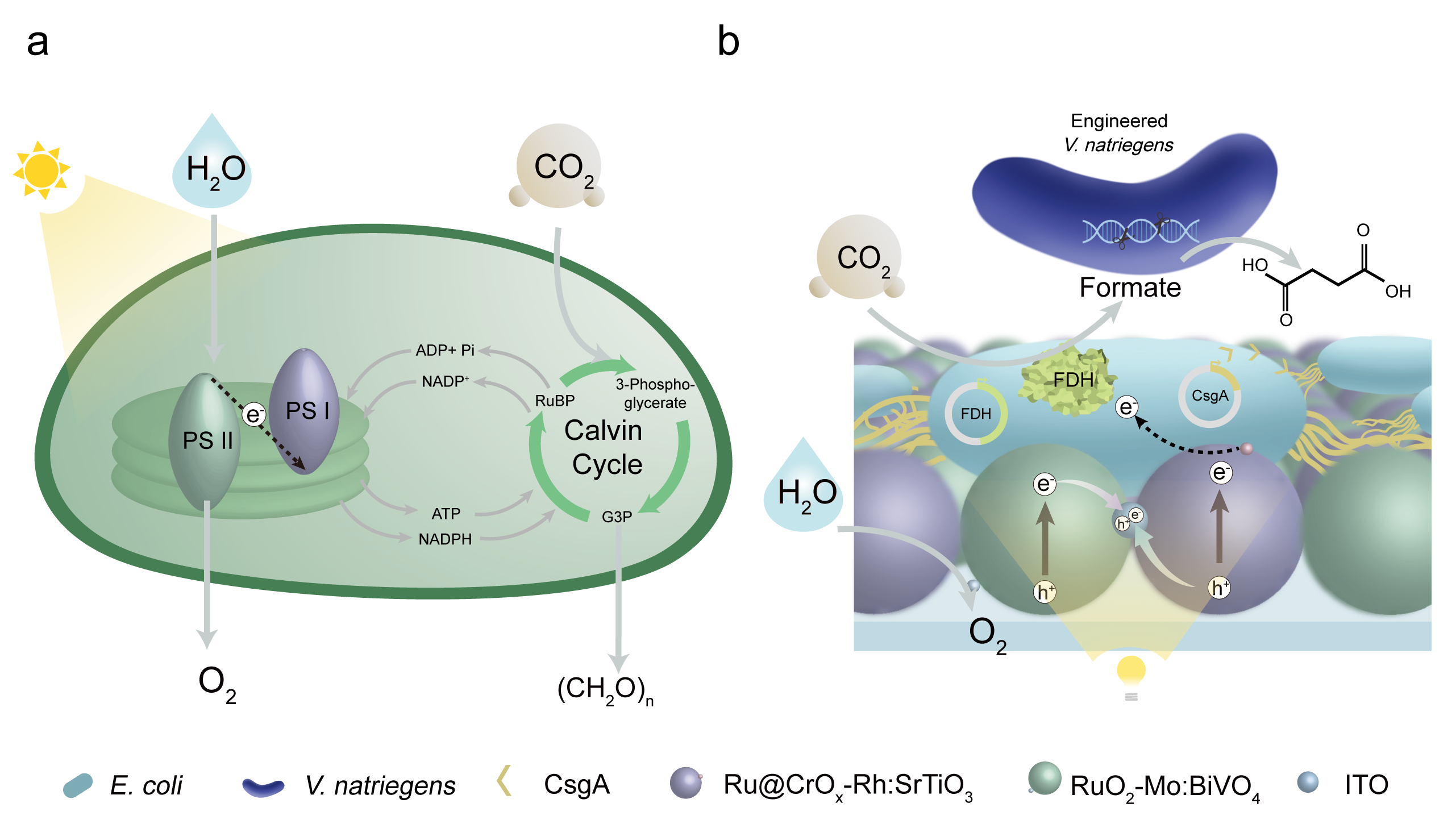 图1.光催化剂-微生物群落生物复合体系实现光驱二氧化碳固定生成琥珀酸