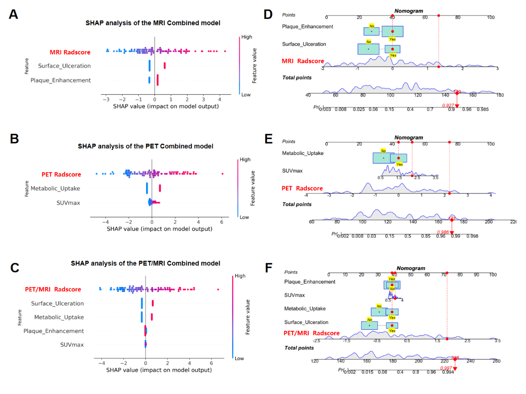 图2:训练队列中MRI、PET及PET/MRI联合模型的SHAP分析(A-C)与列线图(D-F)对比
