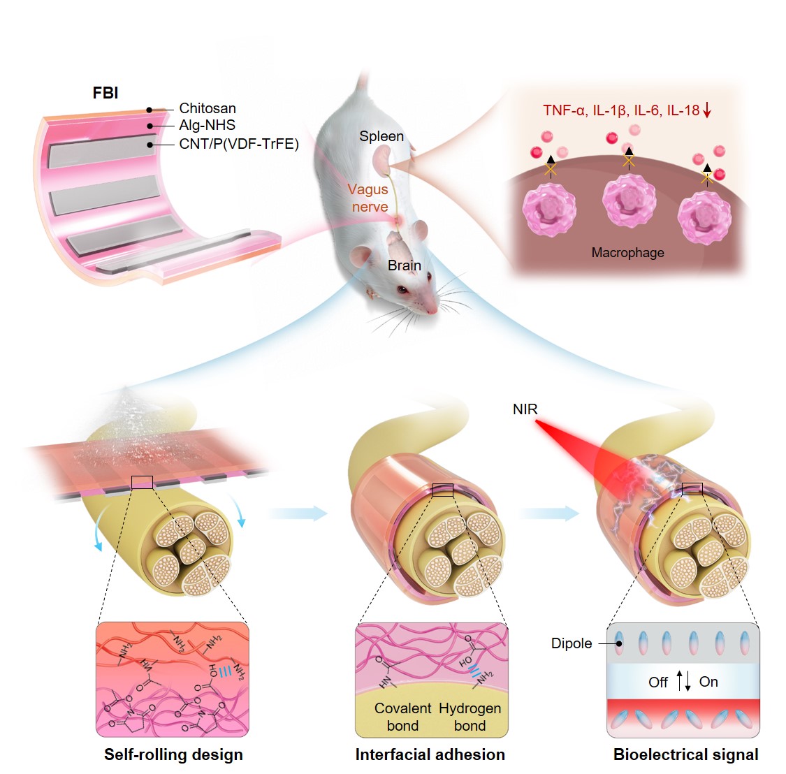 该FBI由三层功能材料协同整合而成,共同赋予其自卷曲、免缝合和仿生电信号输出的多重功能(图1)。其中,底层由具有优异生物相容性的壳聚糖和海藻酸钠天然多糖构建的双层水凝胶基底,在遇水后可自动卷曲成管,精准包裹直径仅约0.5毫米的细小神经,实现无缝贴合;与此同时,水凝胶表面的活性基团可与神经组织表面形成氢键和共价键,提供约50千帕的粘附强度,使器件无需缝合即可牢固固定于神经表面。位于器件上层的聚偏氟乙烯-三氟乙烯铁电高分子与碳纳米管复合条带(CNT/P(VDF-TrFE)),则可在近红外(NIR)光照射下发生偶极子取向偏转,从而产生与天然神经元极化变化所诱导动作电位相似的仿生电信号。基于此,该FBI能够通过NIR遥控,有效刺激神经细胞响应;与传统硅基光电材料相比,其诱发的细胞毒性活性氧水平降低了16倍。在活体实验中,FBI可自动卷曲包裹大鼠迷走神经并实现自粘合,通过激活胆碱能通路进而有效降低血清中促炎细胞因子水平。植入自由活动的大鼠体内长达60天后,FBI不仅未出现移位、神经压迫和局部炎症,而且仍能保持与植入初期一致的抗炎效果。值得强调的是,FBI通过多功能融合,有效解决了传统神经刺激器与神经组织长期存在的界面失配问题,不仅为迷走神经刺激治疗自身免疫疾病提供了更安全、持久的解决方案,其设计理念也有望推广至其他周围神经和中枢神经调控,以及脑机接口、组织工程等多个生物医学领域。