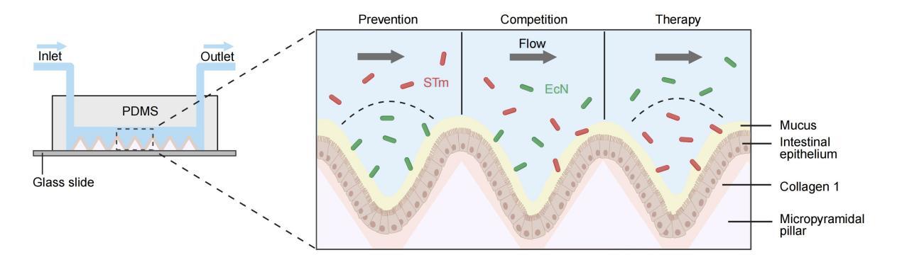 为了贴近宿主肠道微环境并真实还原病原菌感染过程,研究团队开发了一套包含隐窝状微结构的肠道芯片模型。结合计算流体力学模拟发现,芯片中的流体流动不仅产生与肠道生理流动相近的剪切应力,在隐窝微结构附近还产生了显著的法向应力。这种复杂的动态力学环境极大地促进了细菌在隐窝样生态位中的黏附和定殖。在该体外系统中,EcN的预定殖同样表现出极强的保护力,有效阻止了沙门氏菌引起的细胞焦亡和紧密连接破坏,且这种保护效果随着EcN给药剂量的增加和预定殖时间的延长而显著提升。该肠道芯片模型成功实现了活体宏观表型在体外微生理系统中的精准复现,为解析宿主-微生物分子通讯提供了关键技术平台。