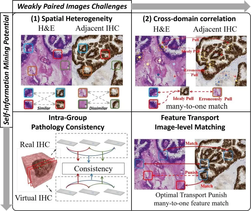 针对这一临床痛点,团队首次将自信息挖掘与非平衡最优传输引入病理虚拟染色,提出了一种基于非平衡自信息传输的弱配对训练方法,通过引入全新的间接学习策略,规避了传统模型中因弱配对图像优化所导致的“病态解逆”问题。此方法显著提升了虚拟染色的病理表达可靠性与准确性。具体来说,该方法解决了以下关键技术难点: