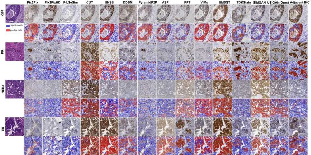 团队首先在 MIST、IHC4BC 两大国际公开乳腺病理数据集(涵盖 Ki‑67、ER、PR、HER2 四大关键标志物)开展系统实验分析。结果显示生成的 HER2、ER、PR、Ki67 虚拟染色结果在细胞结构完整性、染色强度分布以及肿瘤区域表达模式方面均与真实 IHC 染色高度一致,肿瘤细胞核与细胞质的表达边界清晰,背景区域抑制良好,整体呈现出良好的病理语义一致性。
