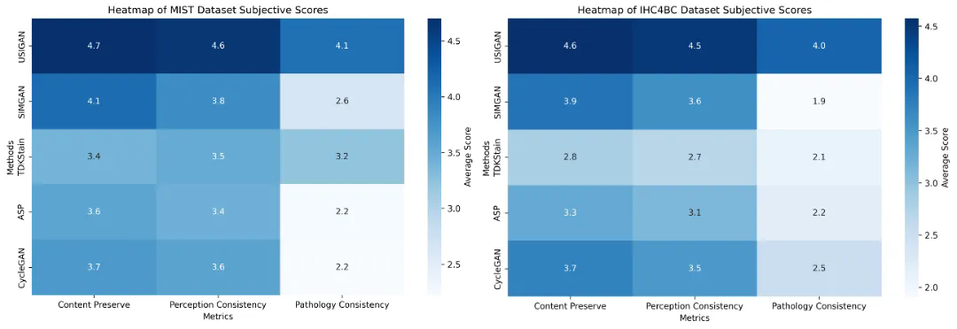 (1)定量与主观评价:通过训练下游分类模型,以及病理医生对虚拟染色图像的评分,分别验证了模型在内容保持度、感知一致性和病理表达一致性三个指标上的性能。评估结果显示,这些指标均达到了临床可接受水平(评分均超过3分/5分)。