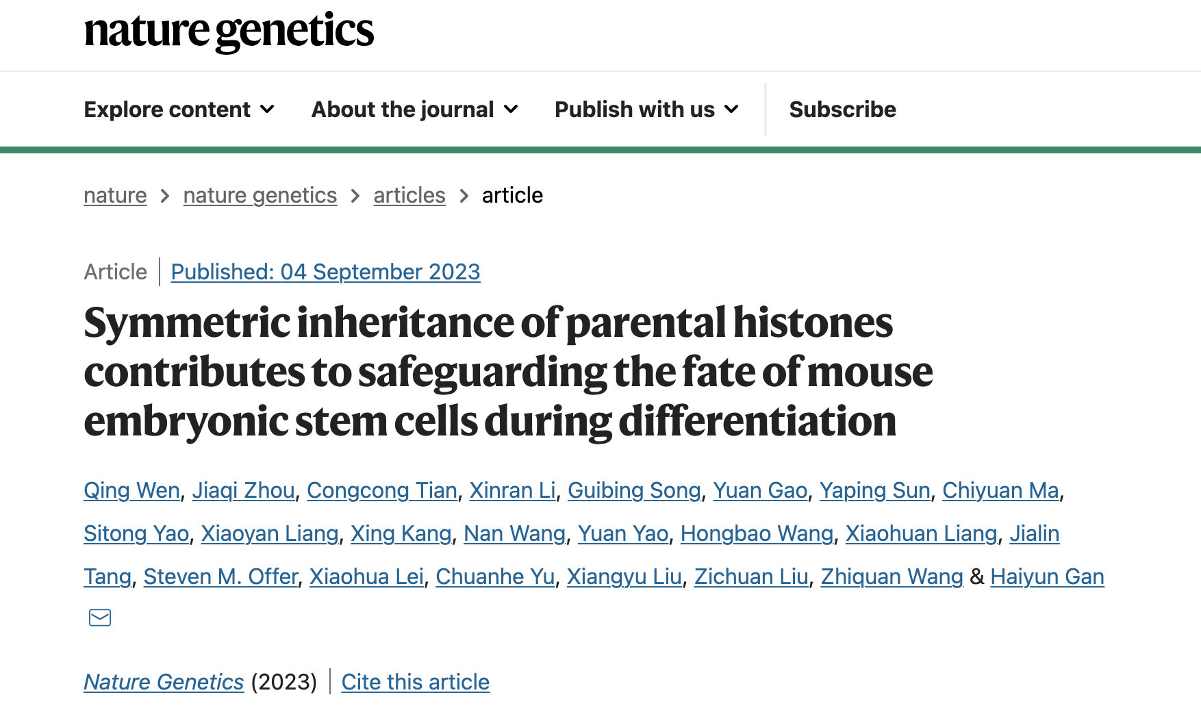 Nature Genetics|亲代组蛋白遗传影响小鼠胚胎干细胞分化和早期胚胎发育