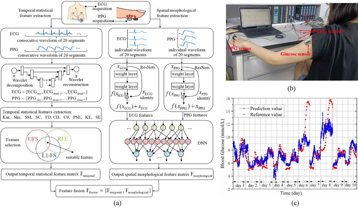 近日,中国科学院深圳先进技术研究院医工所微创中心聂泽东研究员团队在基于生理信息的无创血糖监测技术方面取得新进展,相关研究成果以“Noninvasive blood glucose monitoring using spatiotemporal ECG and PPG feature fusion and weight-based Choquet integral multimodel approach...